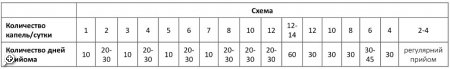 взрослым по 1-2 капли на стакан воды 1-3 раза в сутки за 30 минут до еды, согласно следующей таблице: